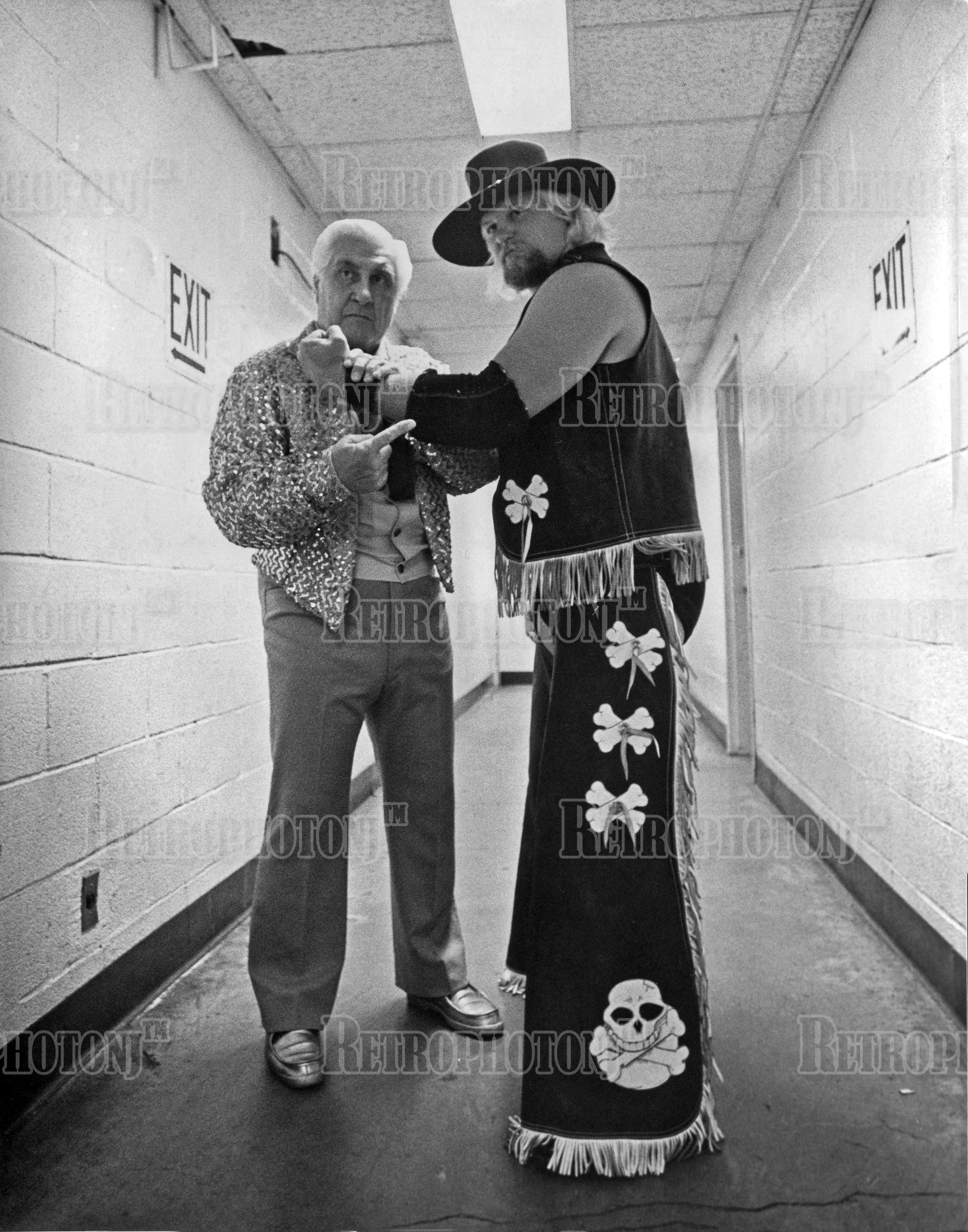 Blassie is regarded as one of the greatest wrestling heels, or villains, of all time. He also acted as a wrestling manager when his ring career ended. He's pictured here with Stan Hansen.